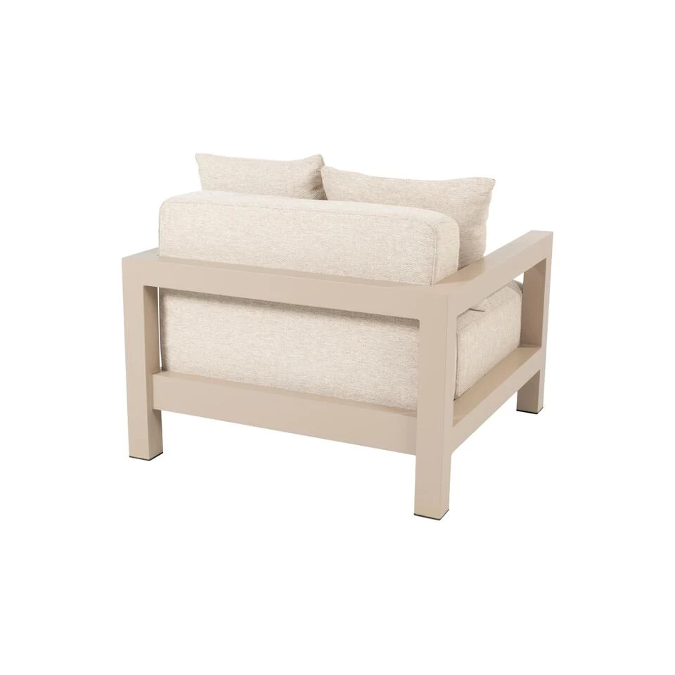 De Raffinato loungestoel van 4 Seasons heeft zijn naam gekregen door zijn geraffineerde uiterlijk. Het aluminium dat een zachte look heeft door de lichte zandkleur en de lichte kussens. Wanneer je gaat zitten voelde je stevige kussens en diepe zit. De zit kan je eventueel iets minder diep maken door één van de bijgeleverde kleine kussens achter je rug te leggen. Zo is er voor iedereen wel een fijne zithouding te vinden. Plaats een enkele stoel in je tuin of combineer deze met de bank of meer stoelen uit de Raffinato lounge serie. Voor iedereen wat wils! Bestellen van deze loungestoel kan direct online!