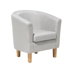 Gestoffeerde fauteuil met lage rugleuning. Deze comfortabele fauteuil met praktische poef nodigt je uit om te ontspannen en brengt nog meer gezellige sfeer in het huis. Dankzij de gebogen, compacte vorm en de gezellige hoes van grijze vlasstof past deze gemakkelijk in elke levensstijl. Robuuste houten poten onderstrepen het klassieke design.