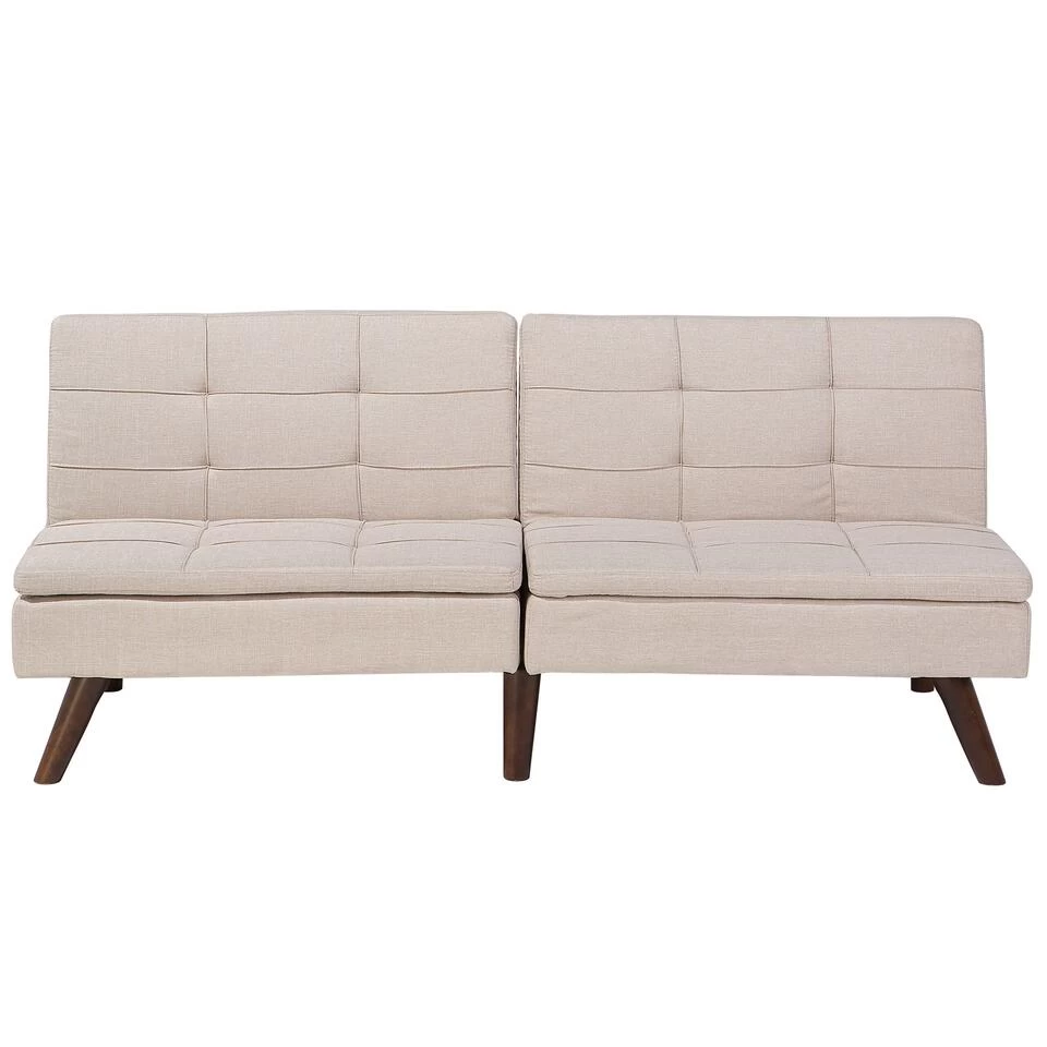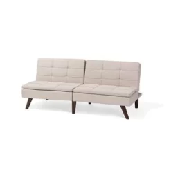 Trendy slaapbank in warm beige. Deze slaapbank is een perfecte keuze als je op zoek bent naar zowel functionaliteit als stijl. De rugleuning van de slaapbank bestaat uit twee losse delen die in 3 verschillende standen verstelbaar zijn. Op deze manier kan de slaapbank gemakkelijk in een bed worden veranderd. De bekleding van de slaapbank is gemaakt van gemakkelijk te onderhouden, zacht polyester. De poten in een warme houttint accentueren de zachte kleuren van de stof.