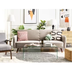 Trendy slaapbank in lichtbruin. Deze slaapbank is een perfecte keuze als je op zoek bent naar zowel functionaliteit als stijl. De rugleuning van de slaapbank bestaat uit twee losse delen die in 3 verschillende standen verstelbaar zijn. Op deze manier kan de slaapbank gemakkelijk in een bed worden veranderd. De bekleding van de slaapbank is gemaakt van gemakkelijk te onderhouden, zacht polyester. De poten in een warme houttint accentueren de zachte kleuren van de stof.