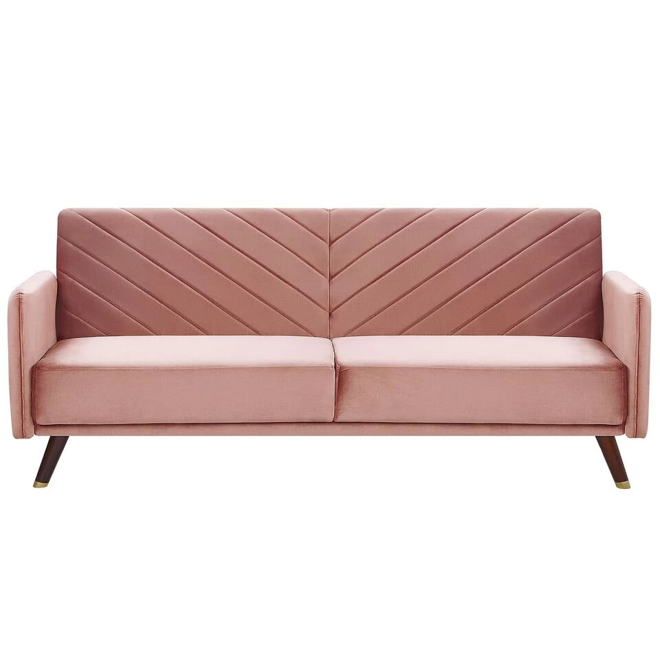 Velvet bank roze. Deze slaapbank past in elke woonkamer en past goed bij verschillende interieurstijlen, of het nu gaat om glamour, modern of mid-century. Het diagonale stikpatroon op de verstelbare rugleuning en de rubberhouten poten in donkere walnoottint geven de bank een Scandinavische uitstraling. Bekleed met zacht aanvoelende, fluwelen polyesterstof, ziet de bank er gezellig en uitnodigend uit. Dikke, met schuim beklede kussens zorgen voor het grootste comfort. Dankzij de slaapfunctie doet hij het ook perfect als logeerbed of als plek om een dutje te doen.