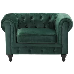 Klassieke, fluweel gestoffeerde fauteuil in groen. Hou je van de traditionele, Engelse stijl en wil je eersteklas zitcomfort en een stijlvolle sfeer? Neem dan plaats op je nieuwe fluwelen fauteuil! De bekleding is gemaakt van hoogwaardige fluwelen stof. De fauteuil heeft de karakteristieke Chesterfield knoopversiering. Deze fauteuil vindt zijn weg in veel verschillende interieurs: zowel klassiek als modern.