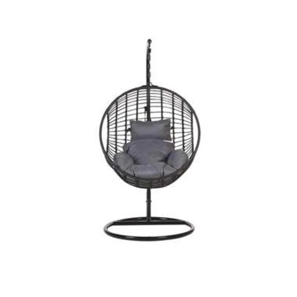Ronde rotan hangstoel in stevig zwart metalen frame inclusief kussen. Deze hangende rieten stoel is een stijlvol stuk dat dankzij de zachte en dikke kussens ultiem comfort zal bieden na een lange dag. Stevig metalen frame zorgt voor stabiliteit en uithoudingsvermogen van het stuk. De mand is gemaakt van PE rattan waardoor hij slijtvast is en in de trendy boho stijl gehouden wordt. Plaats de schommelstoel in de woonkamer, bij het raam of voor de tv of op het balkon om van de frisse lucht te genieten.