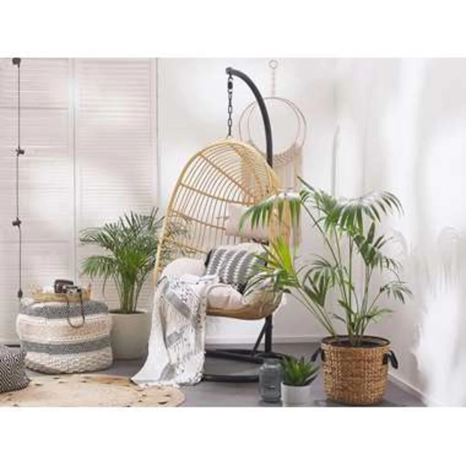Moderne hangstoel in beige met zwart frame inclusief kussens. Een stabiel stalen frame gecombineerd met een prachtige gevlochten mand in een kleur die in elk interieur past en een feel-good karakter aan de ruimte geeft. Dankzij het sterke ketting-ophangsysteem kun je heerlijk heen en weer schommelen. De charmante boho-look van dit model en de zachte, waterbestendige kussens zorgen voor een onbezorgd gevoel, zodat het verblijf op de veranda, het balkon of in de slaapkamer een heerlijk avontuur wordt.