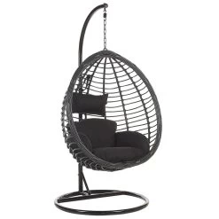 Rotan hangstoel in stevig zwart metalen frame inclusief kussens. In woonkamer, wintertuin of balkon – deze stijlvolle hangstoel van onderhoudsvriendelijk polyrotan heeft een stabiel stalen frame en kan daardoor overal geplaatst worden. De mand is stevig bevestigd via een ketting waardoor hij zachtjes wiegen. De twee comfortabele, stevige kussens zijn waterbestendig.
