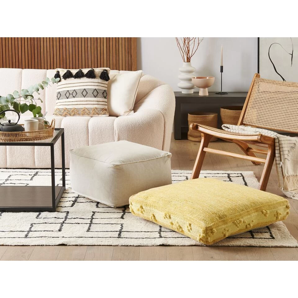 Bohemian stijl katoenen poef in geel. Verfraai je interieur met dit vloerkussen in een mooie gele tint. Gemaakt van katoen, voelt aangenaam aan en is heel licht, waardoor het gemakkelijk van een plek naar een andere kan worden verplaatst. Deze praktische poef is geweldig in een kinderkamer als een plekje om te spelen, of in een woonkamer als een extra zitplaats of een voetenbankje.
