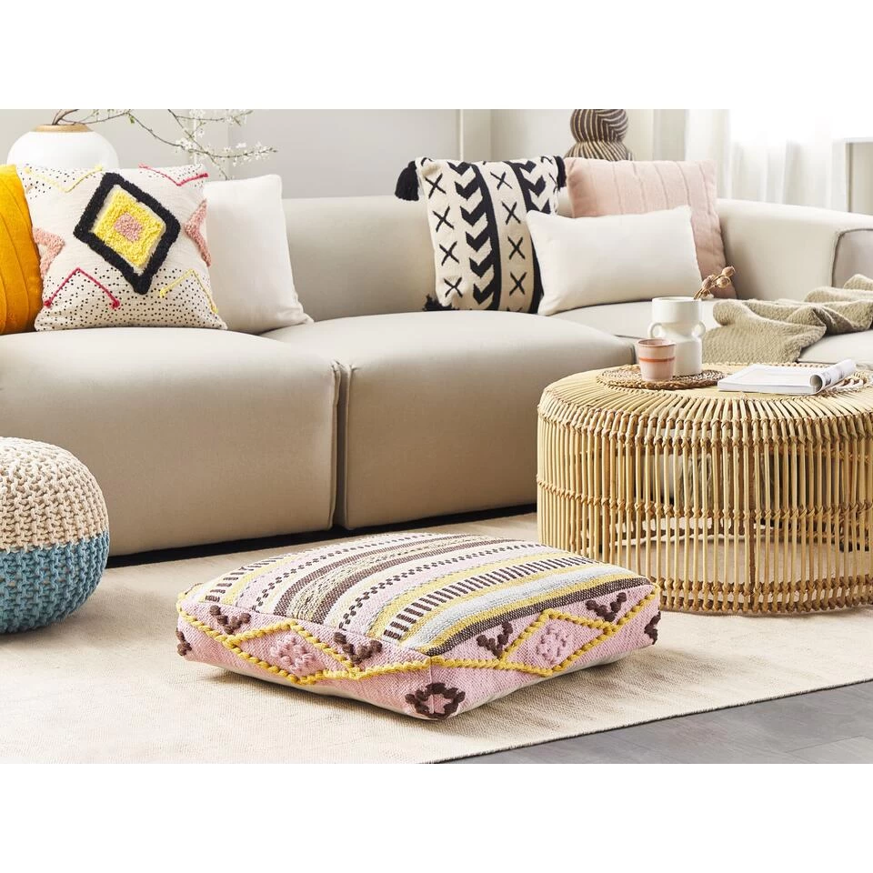 Geweven vierkante poef. Voeg een beetje kleur toe aan je interieur met dit boho-geïnspireerde vloerkussen. Geweven van hoogwaardig katoen, voelt zacht aan en zit comfortabel. Het prachtige geometrische patroon in combinatie met levendige roze en geeltinten past in elk interieur. Dit multifunctionele item, dat als extra zitplaats of voetenbank kan dienen, is een leuke toevoeging aan elke opstelling.