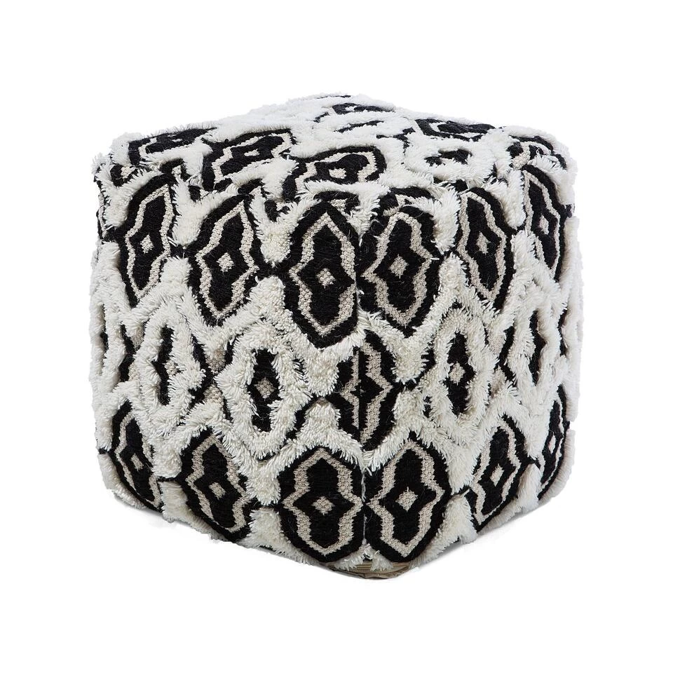 Rechthoekige poef met zwart-wit patroon. Een boho-geïnspireerde poef met een oosterse flair, dit is een gedurfd accentstuk dat een aanvulling vormt op elk traditioneel of Scandinavisch interieur. Door wol en katoen te combineren in een eigenaardig zwart-wit patroon, is het ruig en voelt het zacht aan. De visuele esthetiek van het meubilair voegt diepte toe aan het totale ontwerp en wordt aangevuld met een hypoallergene EPS-bolletjesvulling. Dit maakt de poef ook stabiel, wat betekent dat het meubel kan worden gebruikt als bijzet- of salontafel.