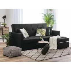 Slaapbank met twee decoratieve kussens. Deze functionele en toch decoratieve slaapbank is dankzij het strakke design een ideale aanvulling op minimalistische, traditionele en moderne interieurs. De bank is royaal opgevuld met lichtgewicht en pluizig schuim en biedt het grootste comfort. De extra kussens zijn voorzien van een afneembare hoes, wat zich vertaalt in eenvoudig schoonmaken zonder zorgen over vlekken. De polyester bekleding in zwart is voorzien van een biscuit tuft op de zitting en rugleuning die samen met de sierstiksels en de subtiele kunststof poten de bank een frisse, eigentijdse uitstraling geeft. De bank kan gemakkelijk worden omgevormd tot een bed voor je gasten dankzij een handig uittrekmechanisme.