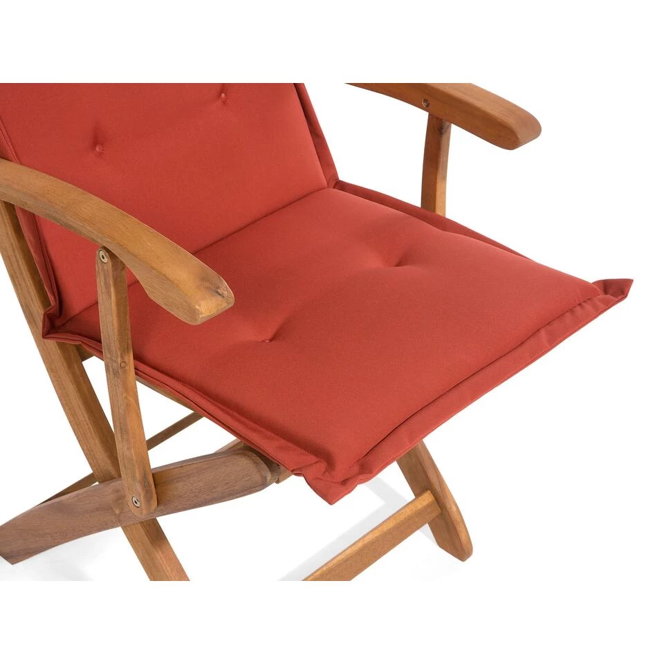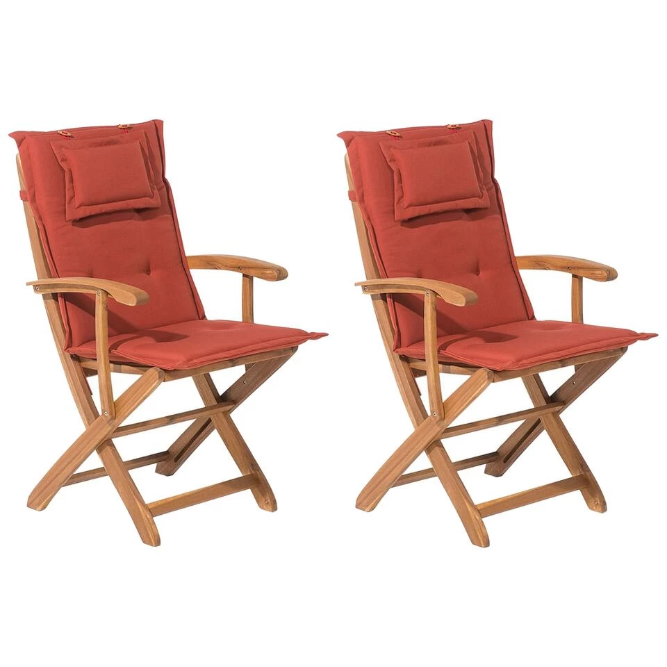Set van 2 houten tuinstoelen met terracotta kussens. De zetel onder de tuinstoelen. Deze tuinstoelen met comfortabele armleuningen zijn een zeer exclusieve toevoeging aan jouw tuin, terras of balkon. Optimaal zitcomfort en een elegant uiterlijk zijn zeer kenmerkend voor deze set, evenals materiaal van hoge kwaliteit. De brede armleuningen bieden extra comfort. Het mooie acaciahout met zijn warme kleur is onderhoudsvriendelijk. Natuurlijk kunnen de stoelen worden ingeklapt om ruimte te besparen. De extra comfortabele kussens maken deze tuinstoelen een absoluut hoogtepunt. Dankzij de waterafstotende coating zijn de kussens uiterst eenvoudig te reinigen.