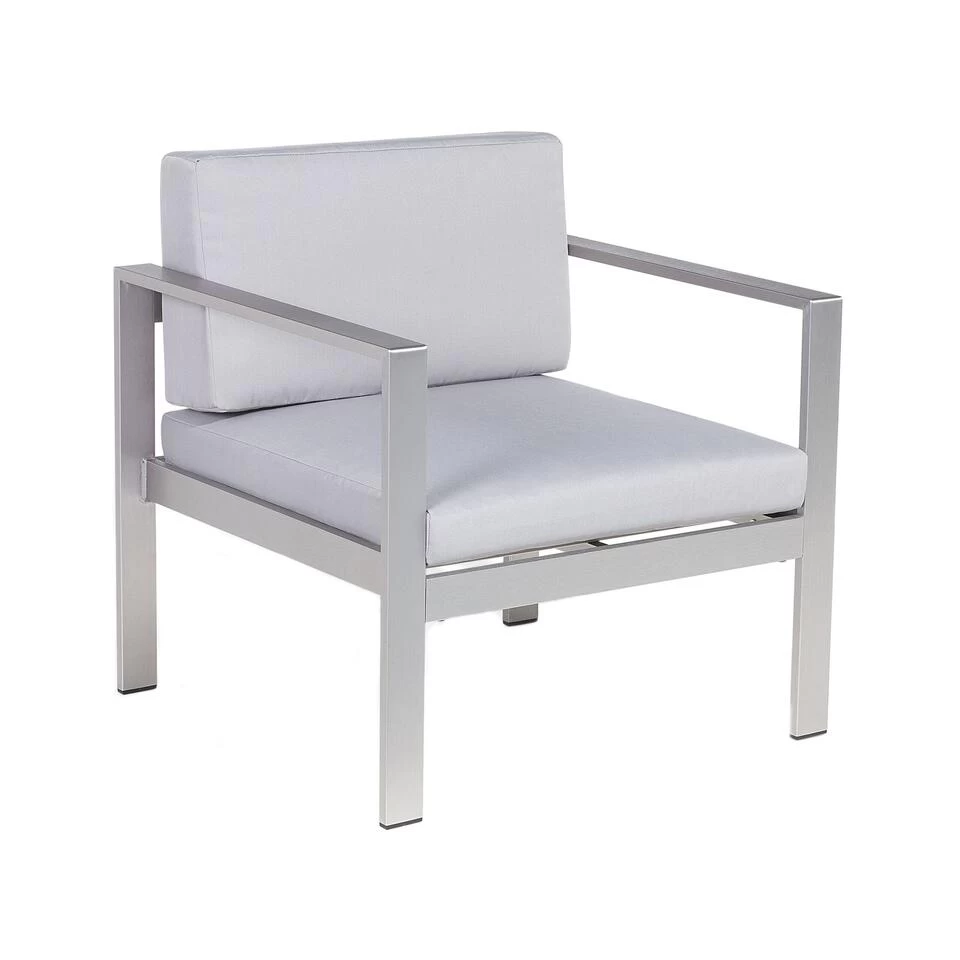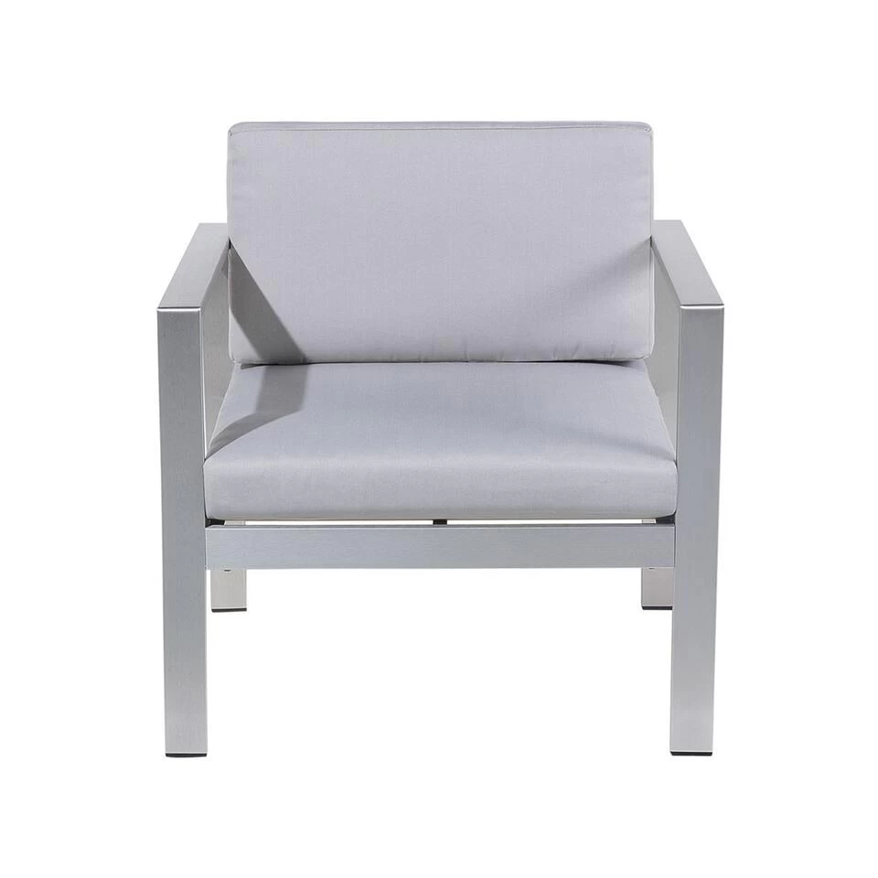 Lichtgrijze metalen tuinstoel. Deze fauteuil creëert de perfecte relaxplek op je terras. Het minimalistische ontwerp op basis van strakke, eenvoudige lijnen past moeiteloos in elke tuin. Twee dik gevoerde kussens bieden het grootste comfort en zijn praktisch voor gebruik in de tuin, bekleed met vochtbestendig, UV-bestendig en vlekbestendig polyester. De neutrale grijstint van de stoel past in elke omgeving en ziet er stijlvol uit. De structuur van de zitting is gemaakt van stevig 100% geanodiseerd aluminium, wat zorgt voor een lange levensduur.