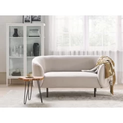 Gestoffeerde 3-persoons woonkamerset. Deze prachtige woonkamerset straalt een luxe gevoel uit, van de zwarte poten tot de zachte rondingen van het gestoffeerde silhouet. De stof ziet en voelt aangenaam zacht en pluizig aan, wat een uitnodigende uitstraling aan de ruimte geeft. De dik beklede zitting biedt comfortabele zitplaatsen, waardoor het de perfecte plek is om te lezen of ’s avonds laat te genieten van tv. Het zachte ontwerp van de set zal perfect passen bij interieurs in eclectische, traditionele of mid century stijl.