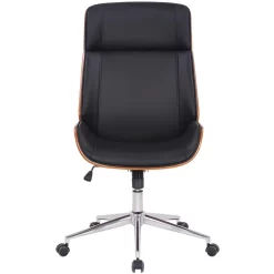 De bureaustoel Varel overtuigt niet alleen door zijn moderne uitstraling, maar ook op het gebied van comfort kan niemand hem voor de gek houden. De bureaustoel is aangenaam gestoffeerd met een kunstlederen bekleding, waardoor hij bijzonder gemakkelijk te reinigen is. Door de traploze hoogteverstelling en het kantelmechanisme is comfortabel zitten zelfs gedurende enkele uren mogelijk. De stabiliteit wordt gegarandeerd door het metalen frame in chroomlook. Met de vijf zwenkwielen kunt u zich gemakkelijk en losjes over de vloer verplaatsen. Het elegante chromen frame en de mix van kunstleer en hout geven het geheel net dat beetje extra en maken het ontwerp compleet.