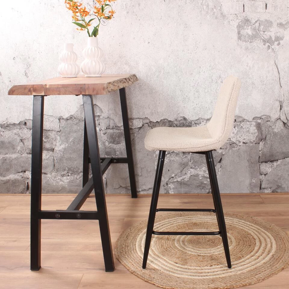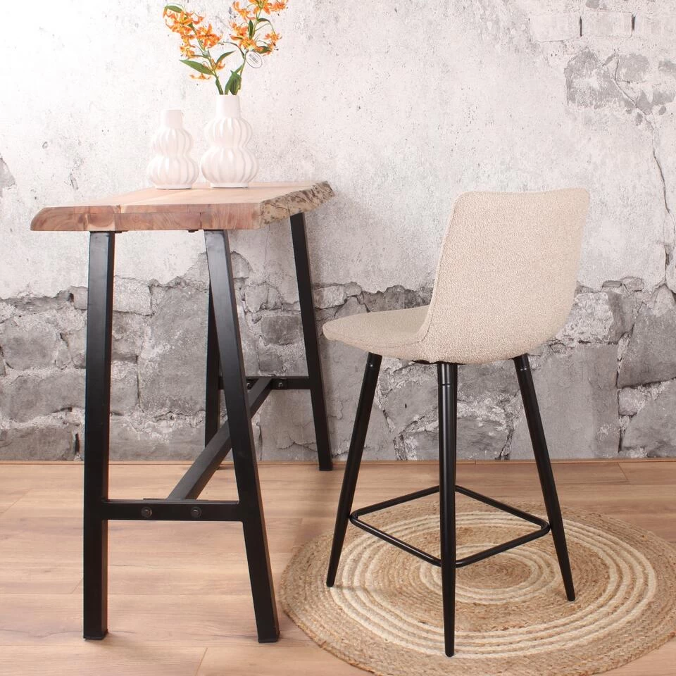 Geef jouw interieur een stijlvolle en trendy make-over met barkruk Gaby uit onze eigen collectie! Deze prachtige barstoel is bekleed met een fijne bouclé stof. Gaby is verkrijgbaar in diverse mooie, neutrale kleuren; ivoor, beige en grijs. De stof is gemakkelijk te impregneren en makkelijk in onderhoud. Dankzij de halfhoge rugleuning en het zachte zitvlak, kan er heerlijk lang op deze kruk gezeten worden. Om dit exemplaar compleet te maken, is hij voorzien van vier stevige zwarte metalen poten met een handige voetensteun. Plaats barkruk Gaby aan het kookeiland en geniet van zijn design en comfort. Gaby is verkrijgbaar in een zithoogte van 65 cm en 75 cm en in velvet. Voor ieder wat wils!