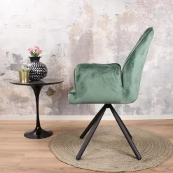 Stijlvol, comfortabel en stoer! Dat zijn de kenmerken van de Armstoel Lucio. Het bijzondere van deze eetkamerstoel is dat hij draaibaar is. De zitting van deze stoel is bekleed met sterk en zacht velours. Daarnaast is de rugleuning voorzien van een sierlijk ruitpatroon. Deze stoel staat op een stevig zwart gepoedercoat stalen onderstel in de vorm van een vierpoot. Om deze stoel extra comfort te geven is hij uitgevoerd met armleuningen. Deze stoel komt perfect tot zijn recht in een industrieel, modern, landelijk of vintage interieur. Armstoel Lucio is verkrijgbaar in vijf populaire kleuren: champagne, zwart, goud, roze en groen.