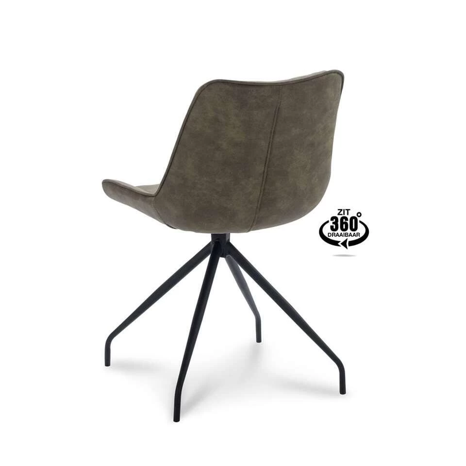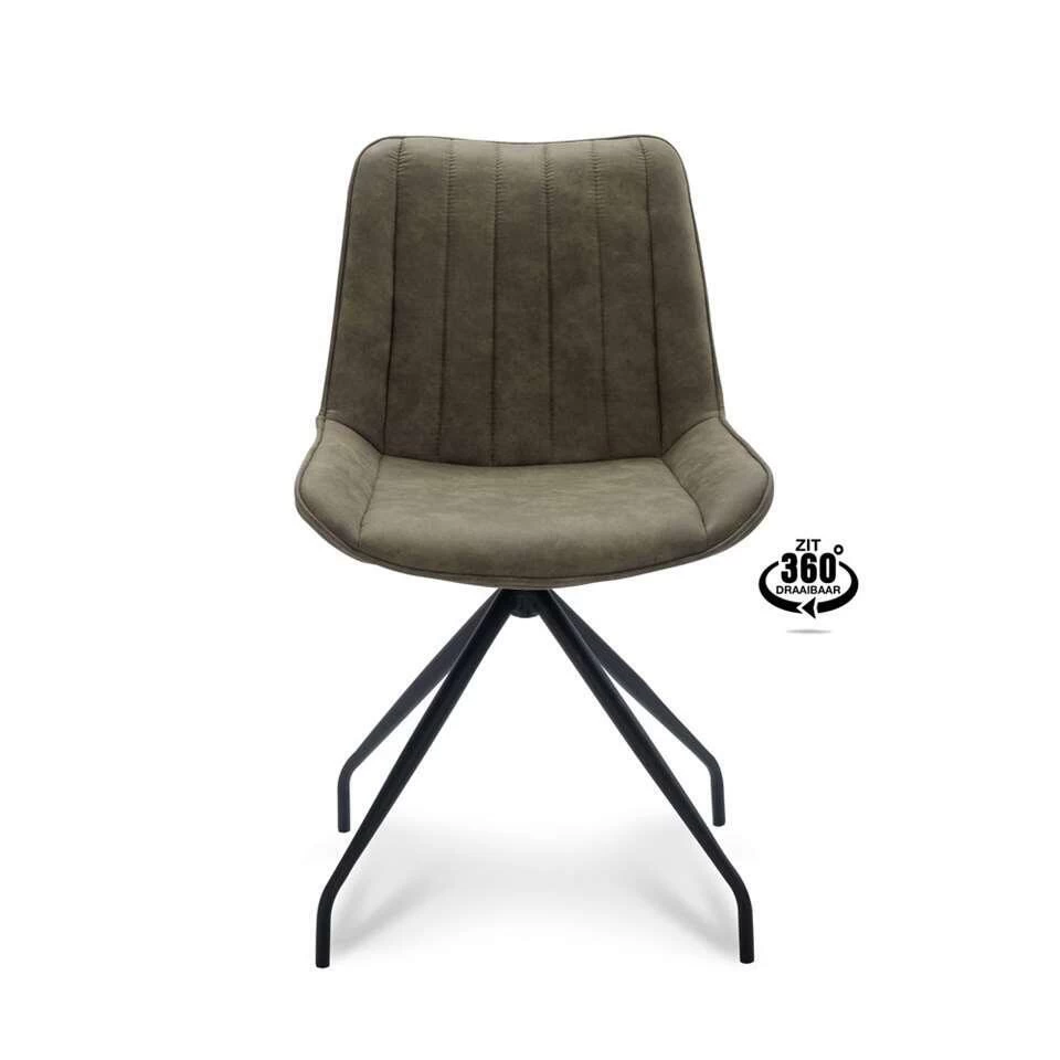 Eetkamerstoel Brody is 360 graden draaibaar. De stoel is bekleed met een stoere en eigentijdse microvezel, in de kleur olijfgroen. De eetkamerstoel heeft een industriële look en hij kenmerkt zich door een hoog zitcomfort. Door de donkere metalen poten krijgt model Brody ook een erg stoere look en is hij passend in vele interieurs. De rug van model Brody is uitgevoerd met een geruit stiksel, wat hem dan ook helemaal van deze tijd maakt. Let op: het betreft een set van 2 eetkamerstoelen.