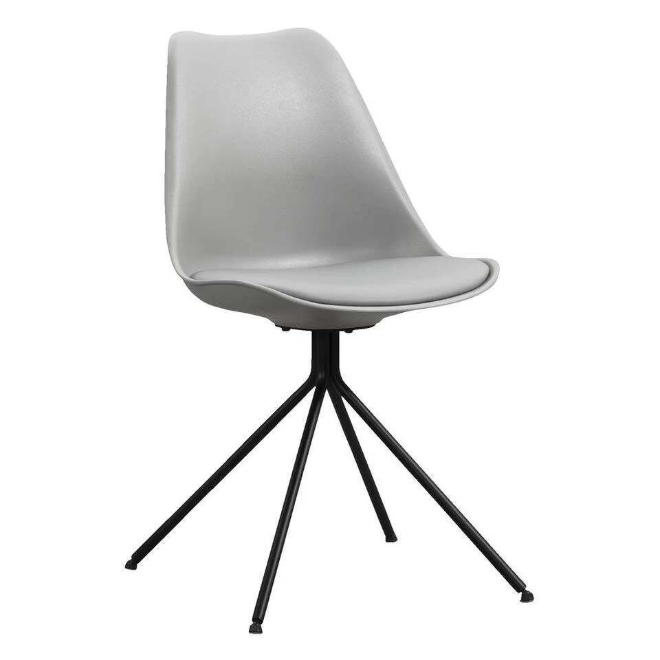 Eetkamerstoel Senja is grijs met een zwart metalen onderstel. Deze moderne stoel is gemaakt van kunststof, dus gemakkelijk te reinigen met een vochtig doekje.