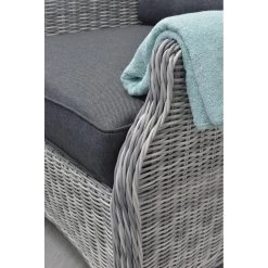Deze Santa Rosa tuinstoelen beschikken over onderhoudsvrij aluminium binnenframe met daaromheen hand gevlochten 5mm half rond kunststof wicker vlechtwerkdraad. Het wicker in de kleur cloudy grey met zwarte kussens. Deze lounge stoelen worden geleverd met bijpassende voetenbank en een handige bijzettafel met glasplaat. Deze tuinmeubelen worden compleet gemonteerd geleverd.