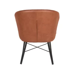 Wave, uitgevoerd in cognac kleurige microvezel heeft een vierkant gevormde zitting met elegante rondingen waardoor er een prettig zitoppervlak ontstaat. De strakke maar zeer elegante rugleuning heeft een ergonomisch design en een trendy uitstraling door de gave golvende vorm. De zwarte naar buiten staande poten, voorzien van een verbindend middenkruis zorgen ervoor dat de stoel lekker stabiel op de grond staat.