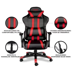 De gaming stoel is verkrijgbaar in 4 verschillende krachtige accentkleuren: rood, zwart, grijs en wit. De gaming stoel beschikt over een comfortabele kuipzitting van zwart kunstleer met mooie accentkleuren waardoor jij tot in de late uurtjes comfortabel kan blijven gamen.