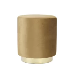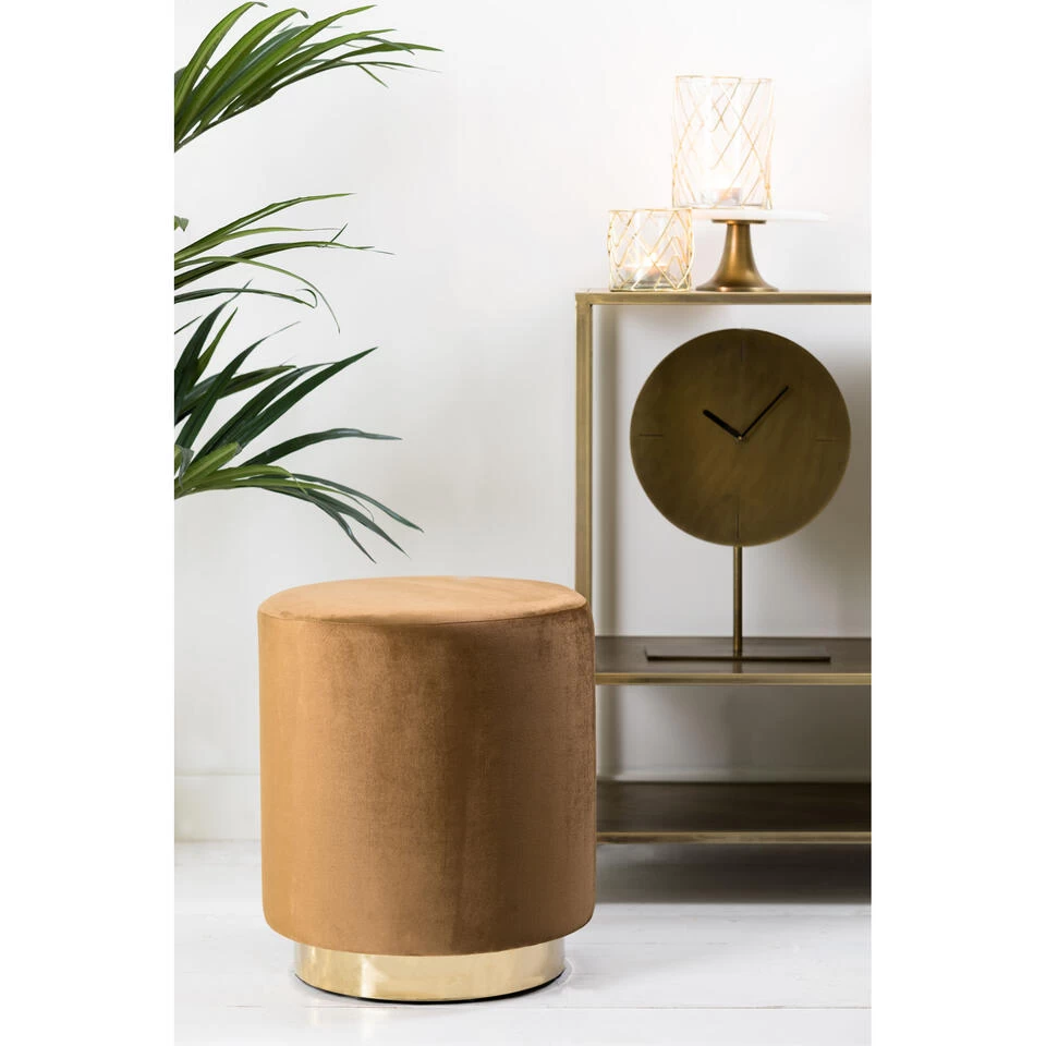 Deze poef heeft een prachtige karamel kleurige velvet stof en een glanzend gouden onderkant van metaal. De combinatie van bruin/karamel en goud zorgt voor een luxe uitstraling. De fluwelen stof voelt zacht aan en zorgt ervoor dat je lekker comfortabel zit. Ook dankzij de gewatteerde zitting zal je comfortabel zitten. Ideaal als eyecatcher in de woonkamer, maar ook gemakkelijk erbij te pakken voor een extra zitplek. De afmeting van deze poef is Ø40×45 cm.