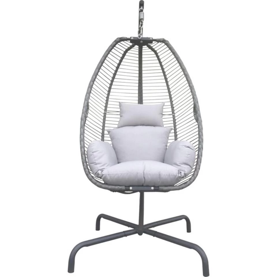 De Rope hangstoel is een eyecatcher in iedere tuin. De zitting is gemaakt van wicker, halfrond en opengewerkt voor een ruimtelijke uitstraling. De wicker zitting is bevestigd op een stalen frame in een antracietgrijze kleur. De hangstoel heeft een diameter van 128cm en is 208cm hoog. Het onderstel is stevig maar sierlijk. Doordat deze hangstoel is voorzien van een poot en geen ophangsysteem kan hij gemakkelijk op iedere gewenste plek worden geplaatst. Het maximale draaggewicht is 120kg. De hangstoel wordt geleverd inclusief grijze kussens van gesponnen polyestervoor optimaal zitcomfort. Rope hangstoel is geschikt voor buitengebruik. Om extra lang van deze gave hangstoel te kunnen genieten wordt aangeraden deze af te dekken in de strenge wintermaanden en bij extreem weer. Plaats deze hangstoel onder de veranda of op het terras en geniet van haar comfort en uitstraling.