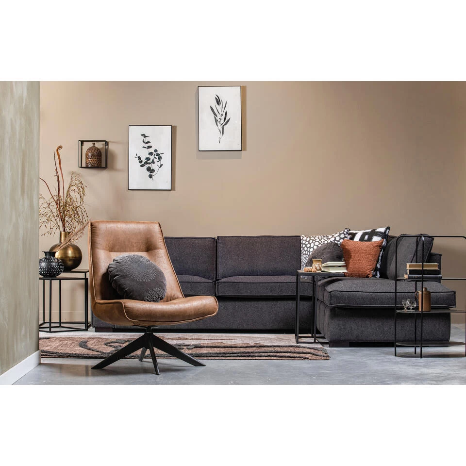Skyler is een draaifauteuil uit de collectie van het Nederlandse merk WOOOD. Skyler heeft een luxe uitstraling, zachte vormen en een comfortabel zitcomfort. De zitting en rugleuning van Skyler zijn bekleed met een PU lederen stof (100% PES) in een warme cognac tint. Het slanke onderstel is gemaakt van metaal voorzien van een zwarte poedercoating. De draaifauteuil heeft een jaren ’70 uitstraling met een moderne touch en past helemaal in de woonstijl van nu.