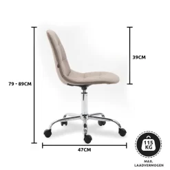 Richtmaten – Totale hoogte: 79 – 89 cm – Totale breedte: 47 cm – Totale diepte: 56 cm – Zithoogte: 44 – 54cm – Zitting: 47 x 41 cm – Hoogte rugleuning: 39 cm – Max. Laadvermogen: 115 kg – Gewicht: 11 kg